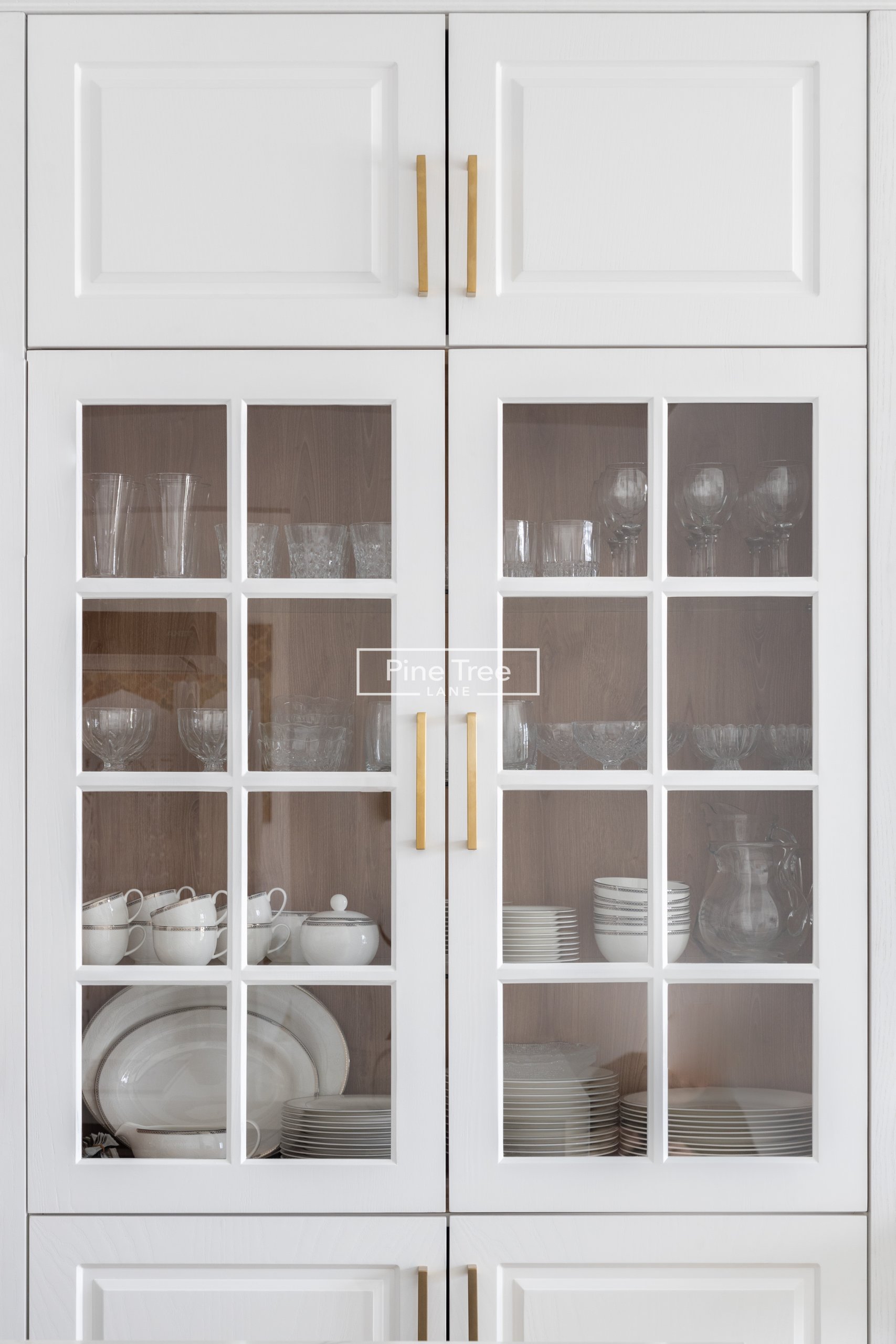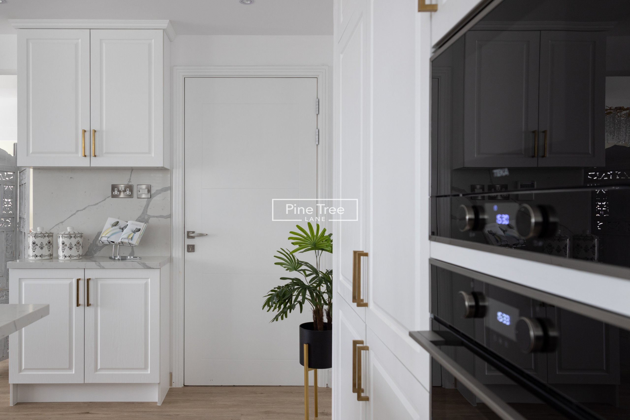 This modern kitchen features organized spice jars, a wooden cutlery tray, marble countertops, and gold handles. Smart storage and ambient lighting enhance functionality and style, creating a clean, efficient, and inviting space for everyday cooking and entertaining.