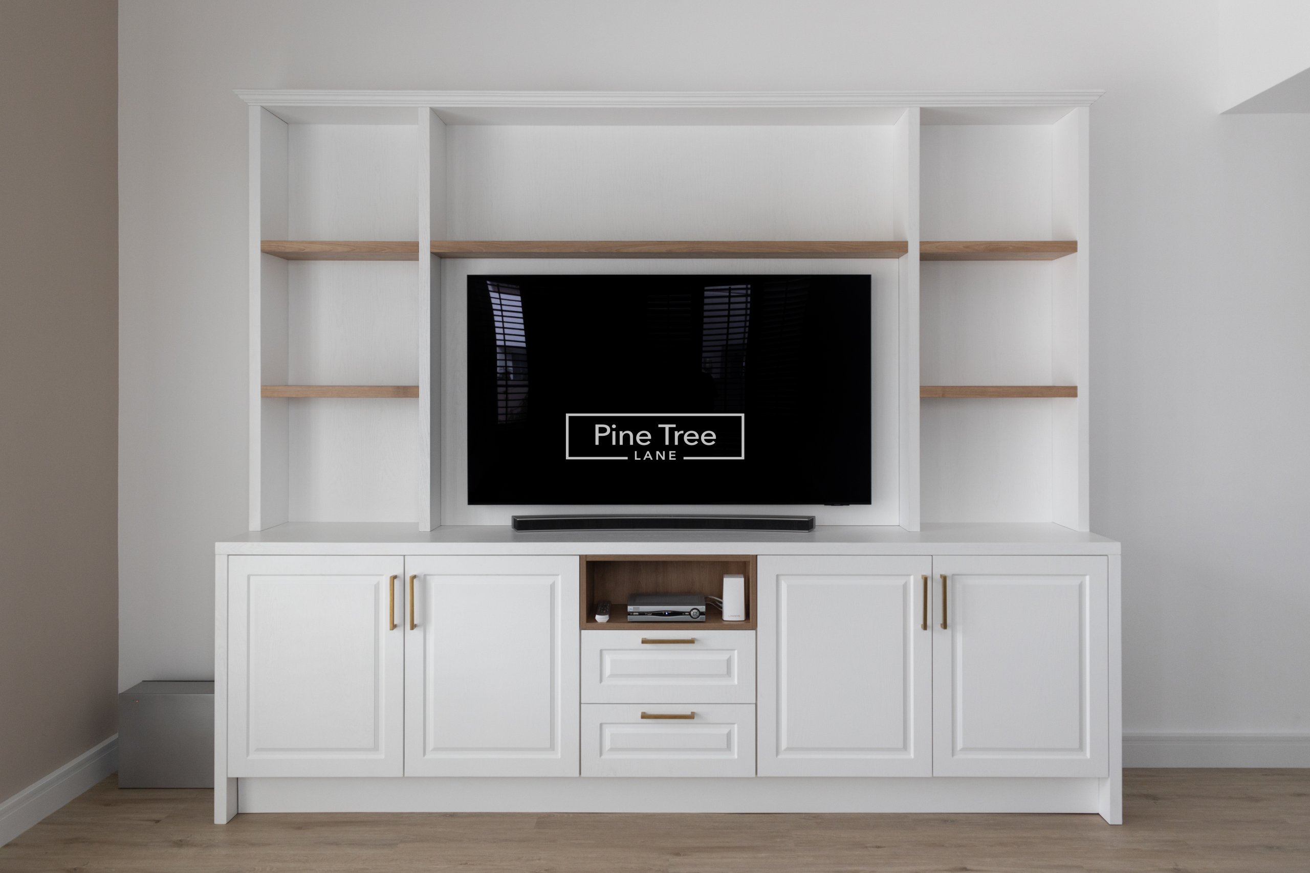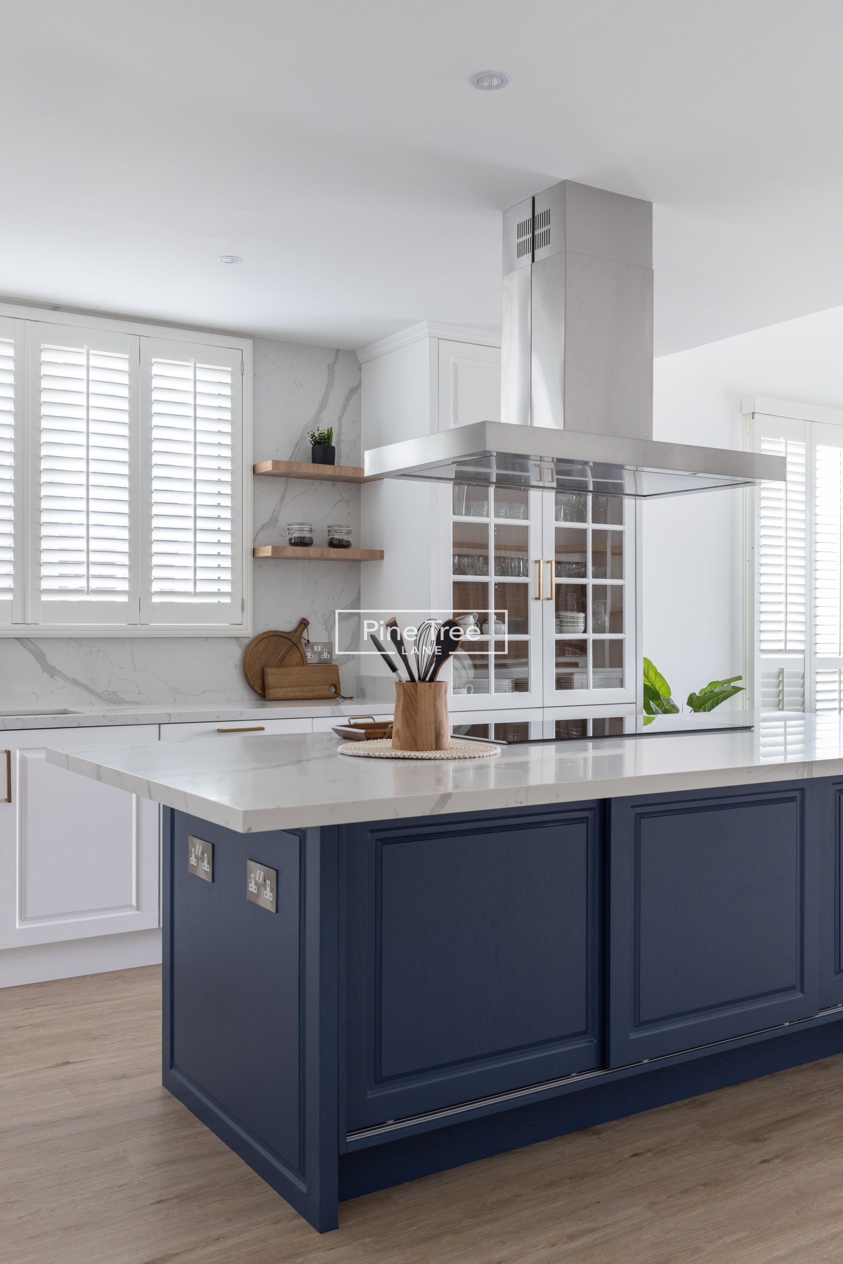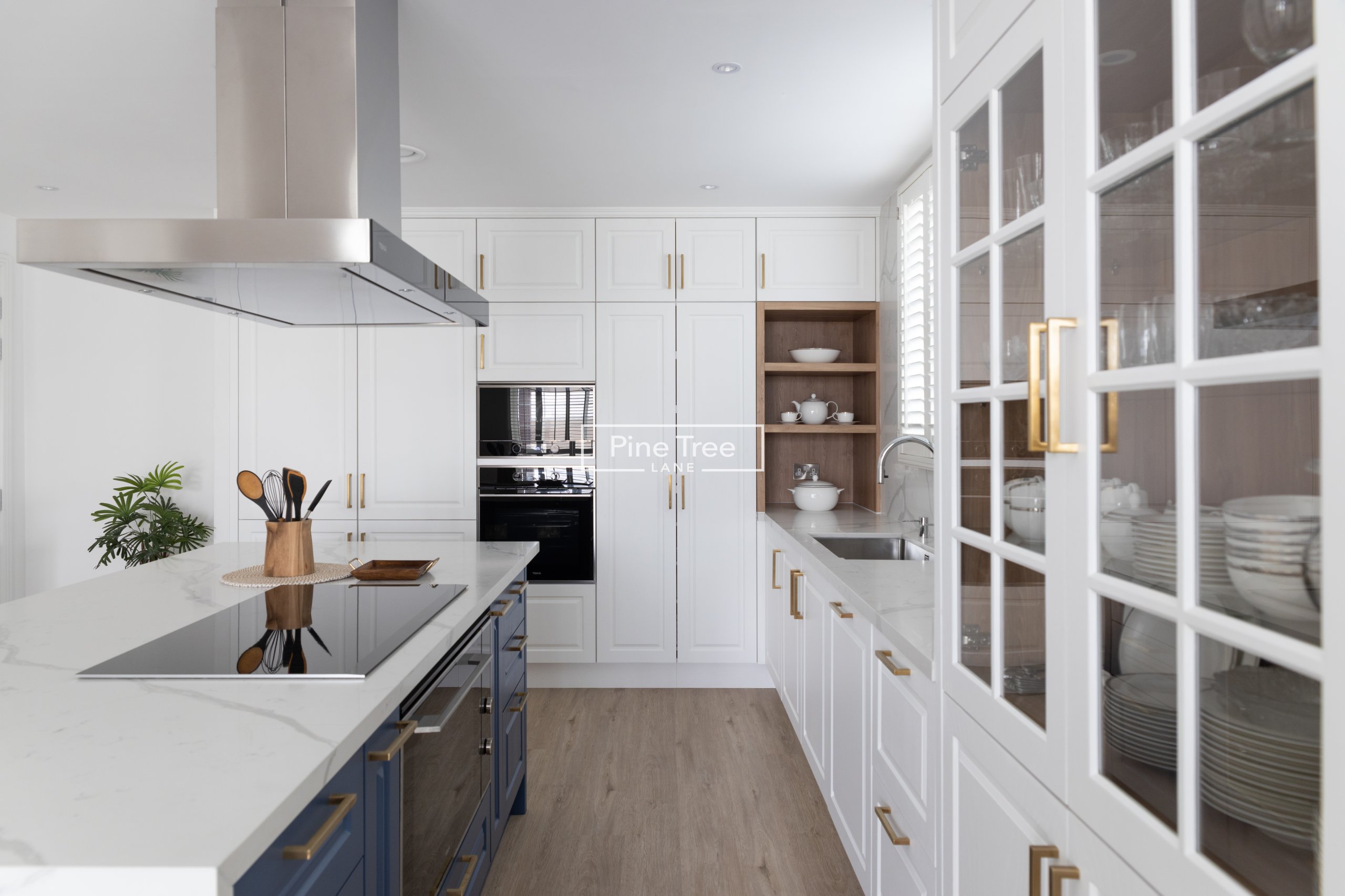 This bespoke kitchen design features a striking blend of classic white cabinets and deep navy-blue base units. Marble-effect countertops and splash backs elevate the space, complemented by gold accents, ambient lighting, and warm wood textures for a welcoming ambiance.