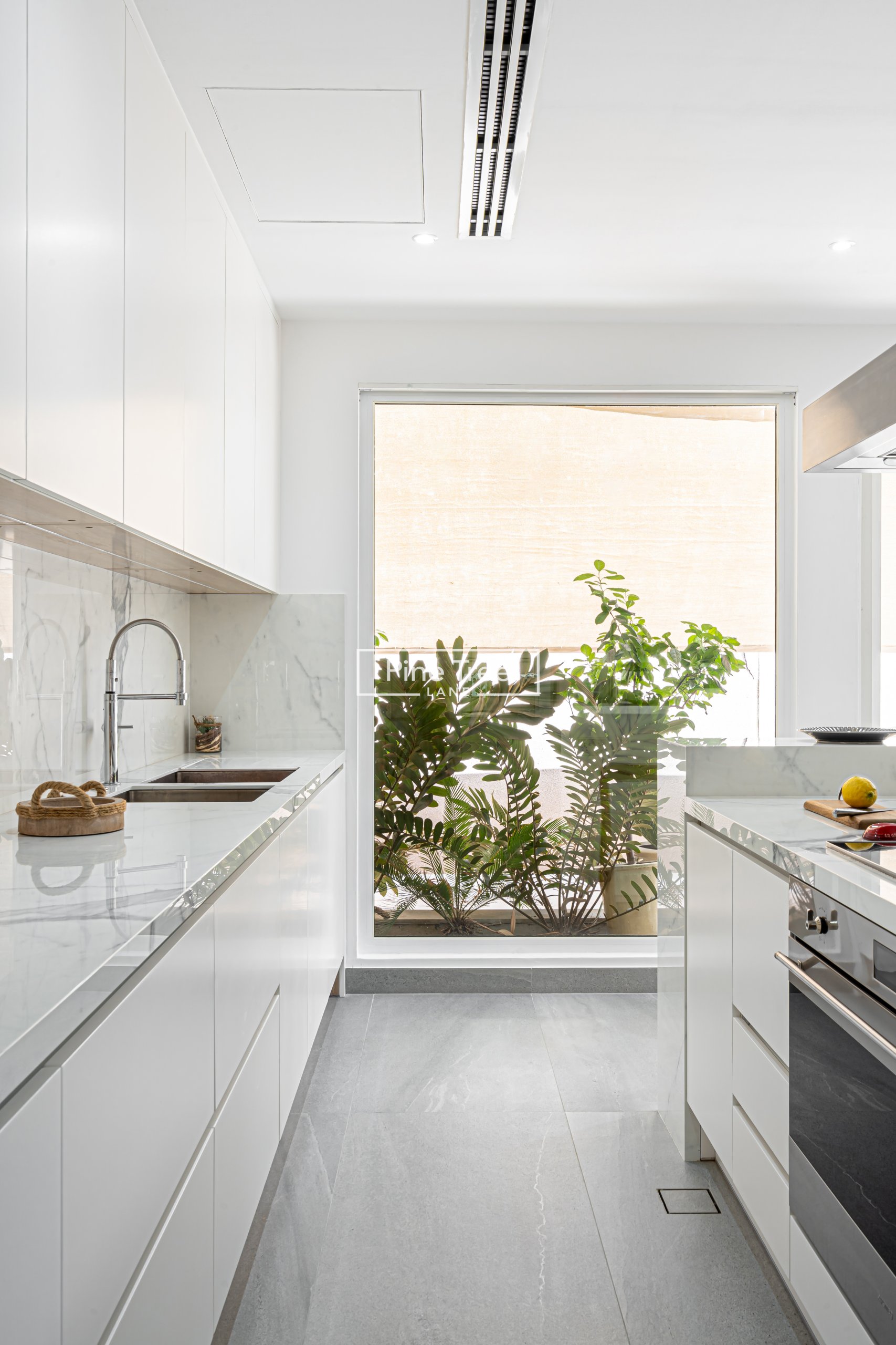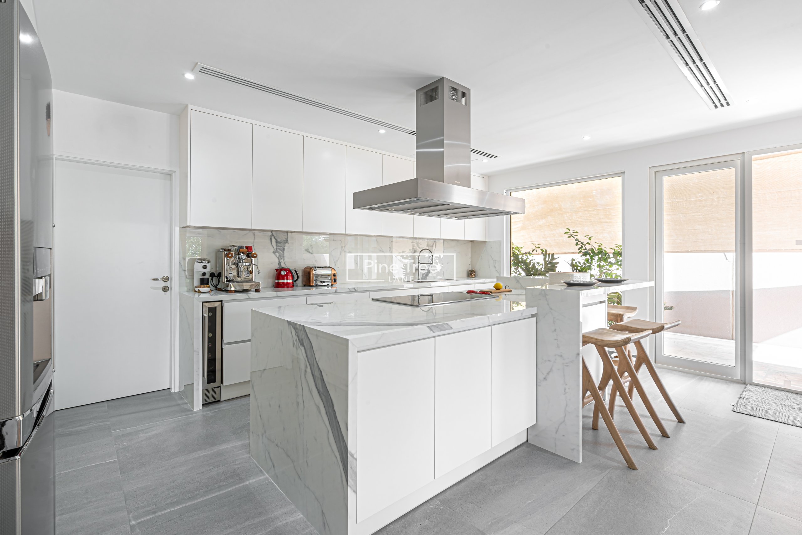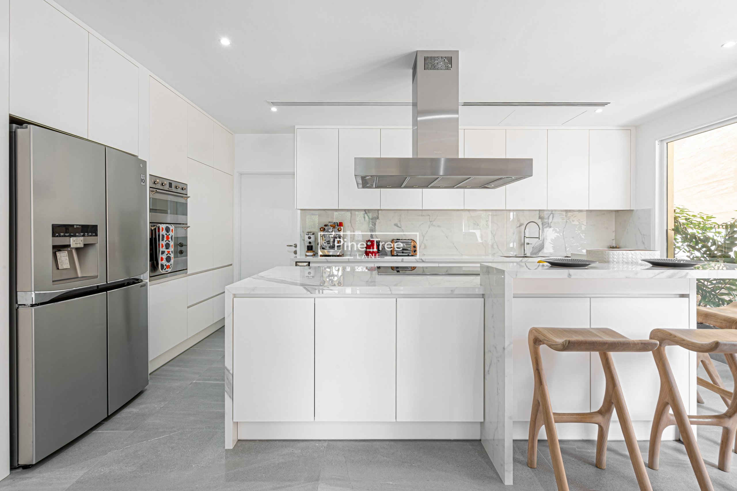 “We designed this kitchen with custom white cabinetry and marble surfaces, featuring a marble backsplash. Our joinery includes hidden storage, a sleek range hood, and bar stools, complemented by large windows, greenery, and grey stone flooring for a bright, premium space.”