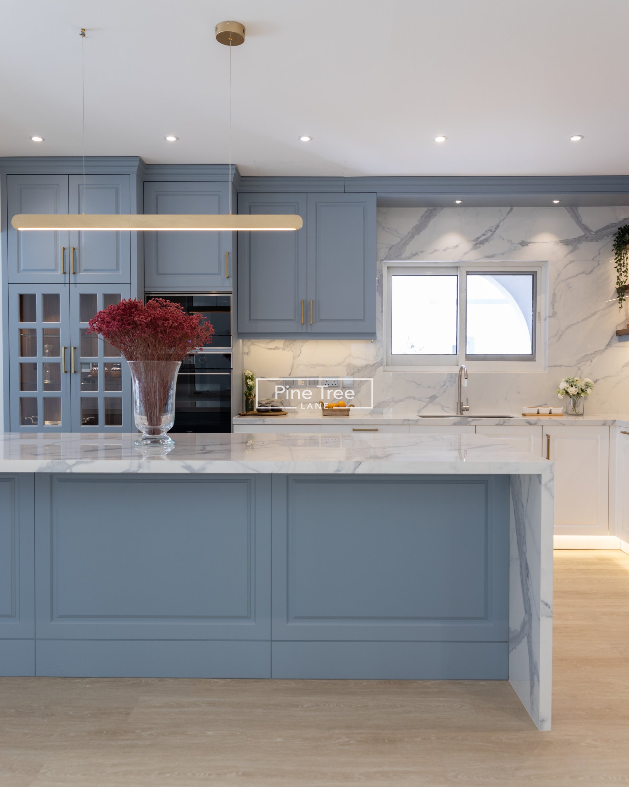 This luxurious kitchen showcases premium white and grey marble surfaces, handcrafted cabinetry with soft blue tones, and gold hardware. Open shelving, ambient lighting, and seamless joinery enhance both style and functionality, perfectly suited for upscale villa interiors.